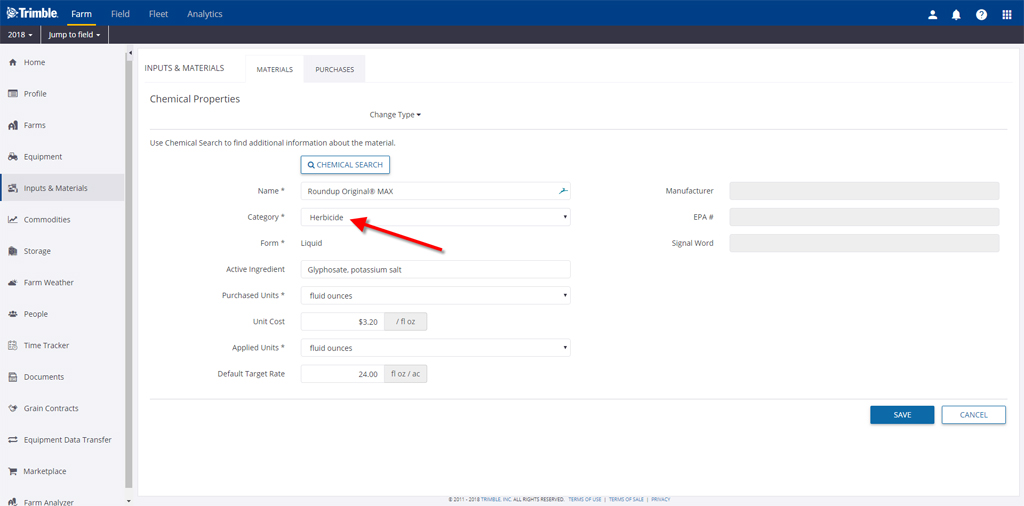 - Assign Chemicals to a Category — All chemicals created within the Materials area can now be assigned to a Category. This ensures that any tasks that use the chemical (including tasks created by verifying equipment activity) will show up in the expense breakdown of Field Manager.