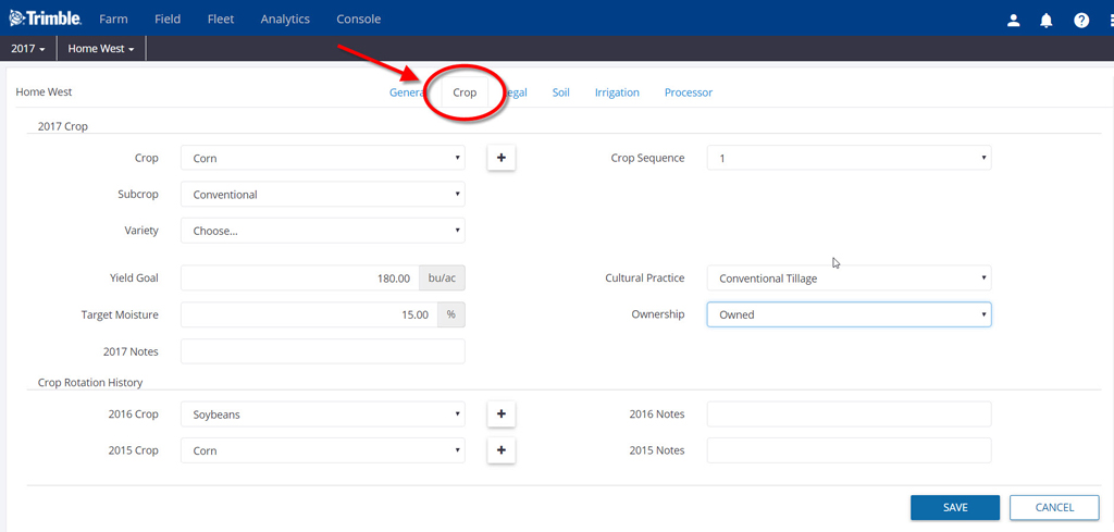 The Crop tab allows you to easily add crop types, yield goals, ownership, crop rotation history and more.