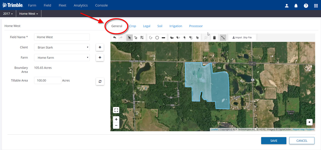 The General tab allows you to add/edit field, client and farm names as well as creating a field boundary.