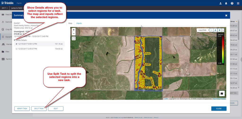 - Split Task Sessions — It is now possible to view details of Equipment Activity and select one or more regions/sessions and split them into a separate task. This makes it possible to break a task that covers more than one field into separate tasks and then assign them to the correct field(s).